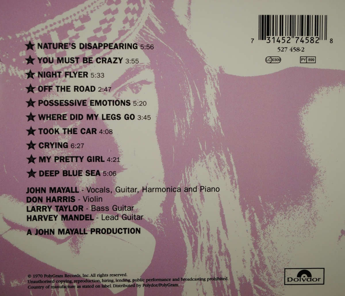 With his new all-American line up, Mayall pursued the jazzy blues experiment documented on his live album The Turning Point. This unusual format (electric guitars by Mayall and Mandel, Mayall playing piano and harmonica as well, Harris’s electric violin, Taylor’s acoustic and electric bass, and no drums) the band created a unique sound and recorded this series of songs mostly chronicling Mayall’s then-romance with Nancy Throckmorton (a theme he first visited on Empty Rooms), who provided some photography for the album jacket. “Nature’s Disappearing,” the album’s opening song, dealt with environmental issues, the only song on the album that didn’t address Mayall’s romance.