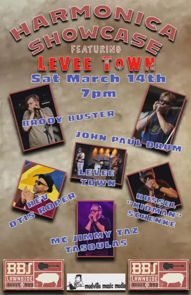 This will be a BLOWOUT with all your local harp heroes! Brody Buster, John Paul Drum, Reverend Otis Roper Jr., Russ “Kidman” Schenke, emcee’d by Jimmy Taz Tasoulas and backed by Levee Town! Sure to be a very hot night!