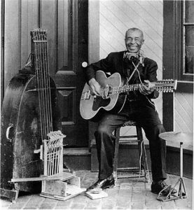Fuller had a knack for music and without encouragement or support, he was able to nourish this talent until he was a passable musician. When he was seven years old, he made a mouth-bow. Later, he claimed that he had never seen a mouth-bow and the idea just came to him. (For those who don’t know, a mouth-bow is not unlike the home made bows for shooting arrows that kids use to make when they played cowboys and Indians, except the mouth-bow had a notch in one end. The notch is held against the mouth while the string is plucked, making a sound something like a Jew’s harp.) Next, Fuller fashioned a cigar-box guitar on which he tried to imitate the music that he heard at Saturday night frolics. This was all in the first decade of the twentieth century when the blues were new, and undoubtedly, Fuller, in his extensive travels, made contact with some of the Initiators of the East Coast brand of the blues.