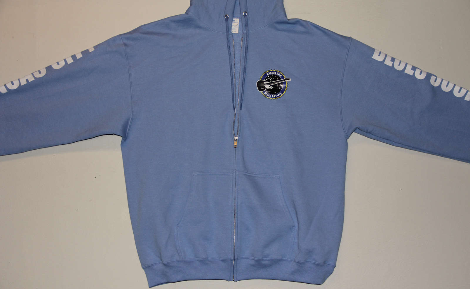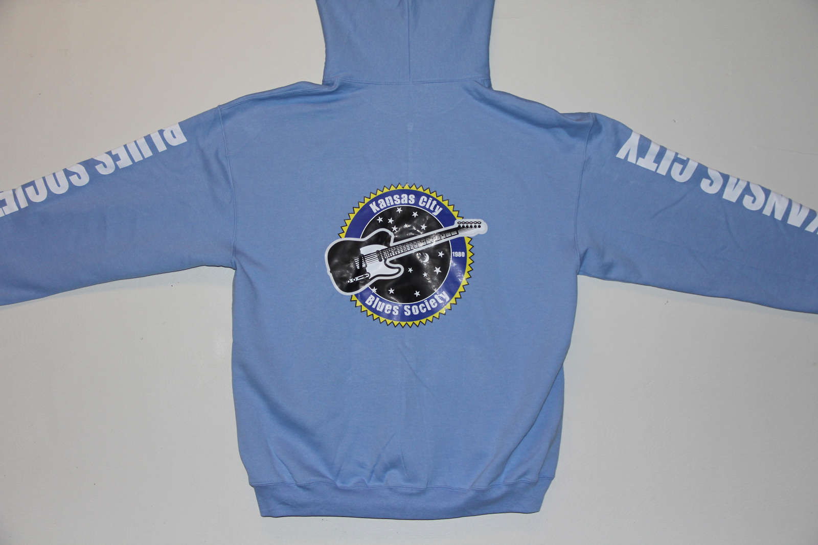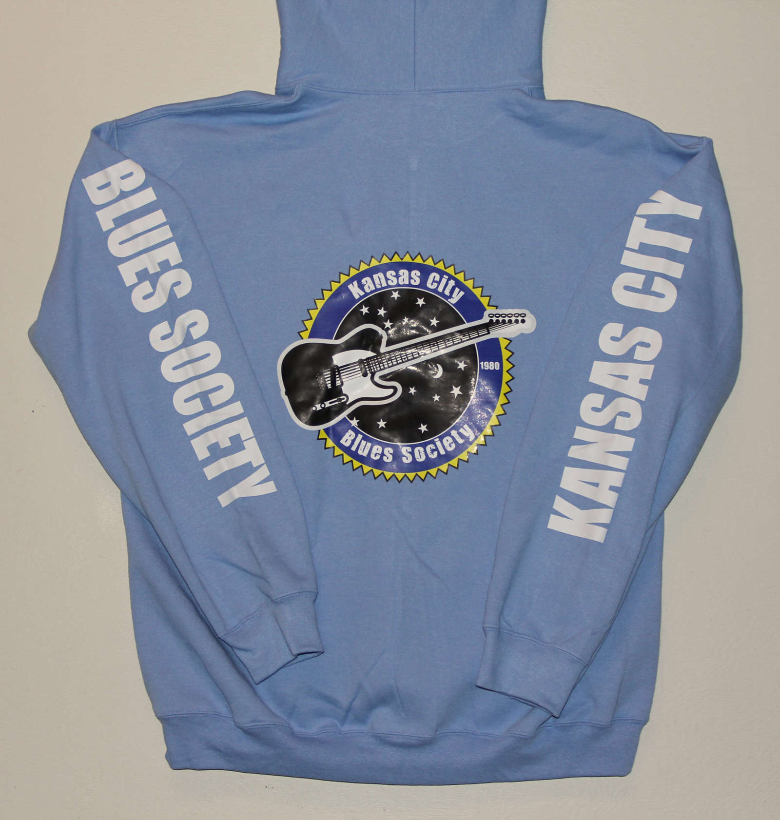 An adorable and soft long sleeve hoodie, light blue, large KCBS logo on the back. “Kansas City Blues Society” on the arms.