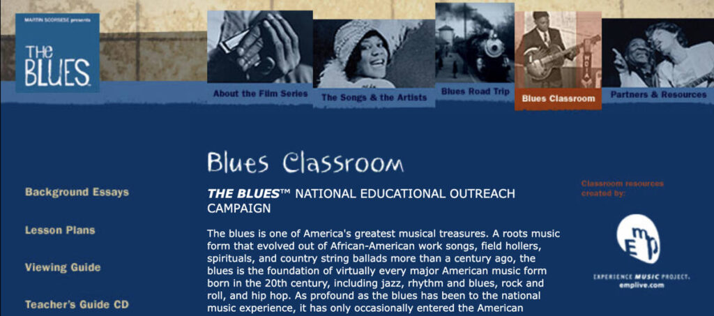 In 2003, PBS, in conjunction with the Experience Music Project and a select group of teachers skilled in the strategies of teaching blues music and culture, created a teacher’s guide to assist in the integration of blues music, culture, and history into American classrooms for students in grades 9-12. It was developed in conjunction with Martin Scorsese’s 2003 production of The Blues documentary film series. This teacher’s guide and accompanying CD was originally distributed to nearly 25,000 high school educators throughout the United States.